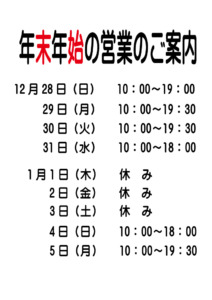 営業時間:平日:AM10:00 ~ PM 7:30/日・祝日:AM 10:00 ~ PM 6:00